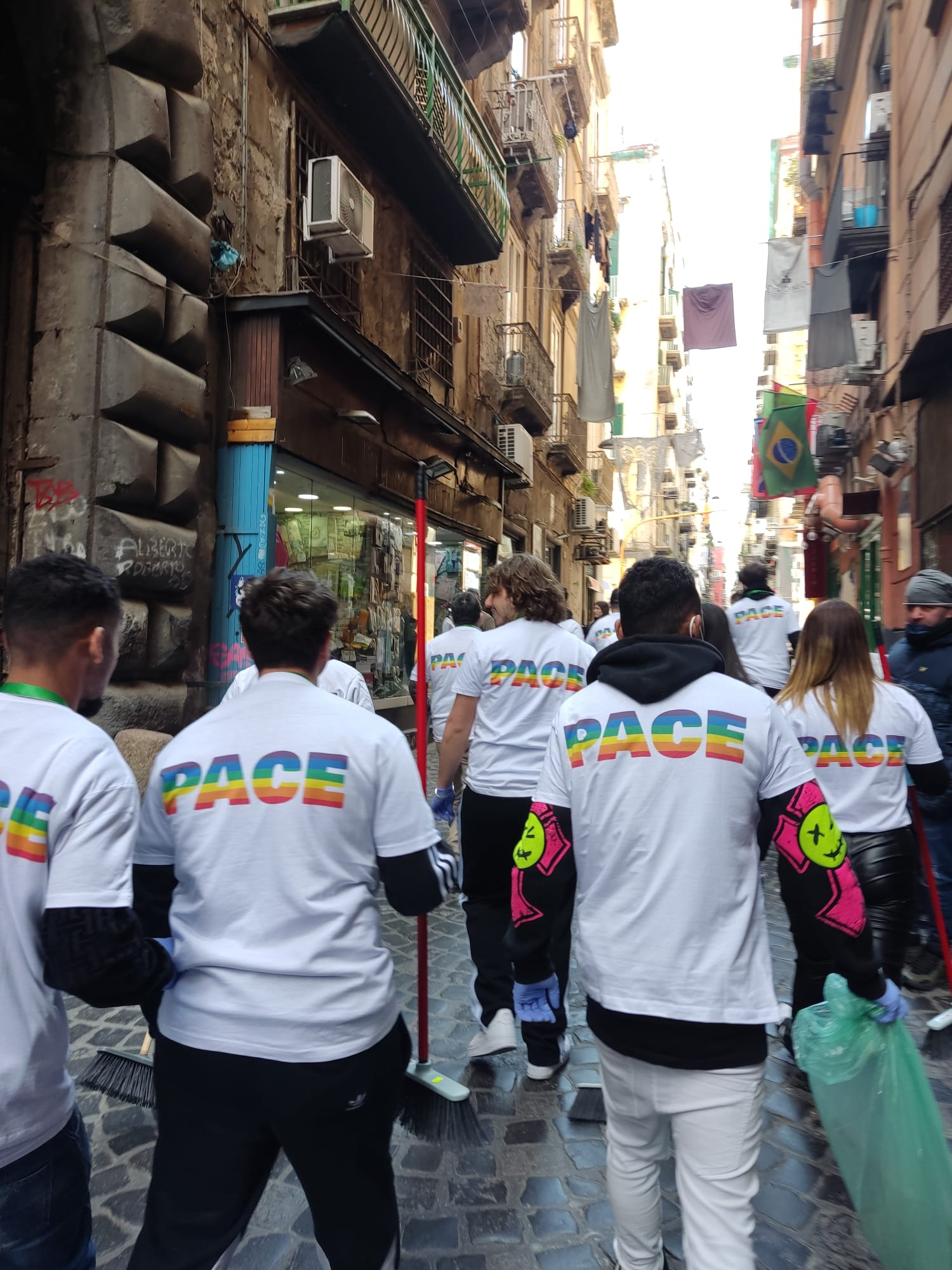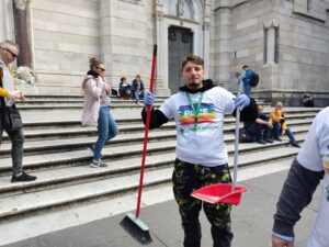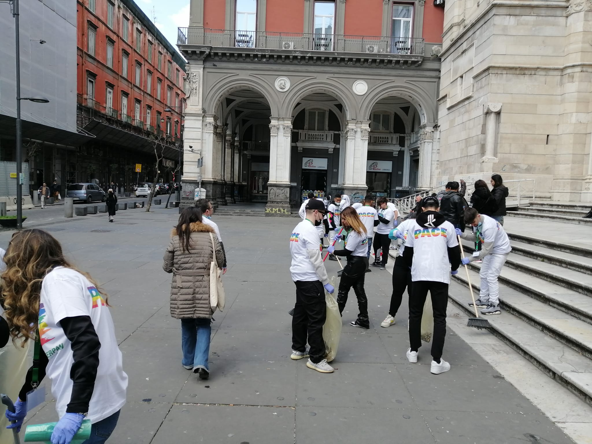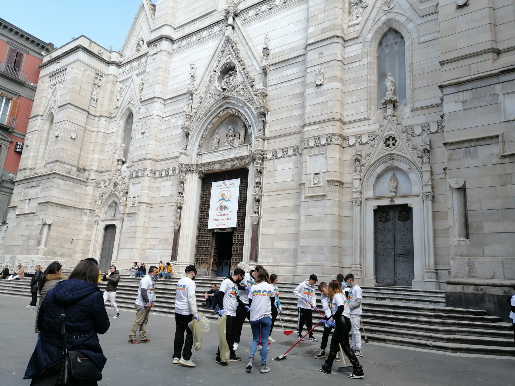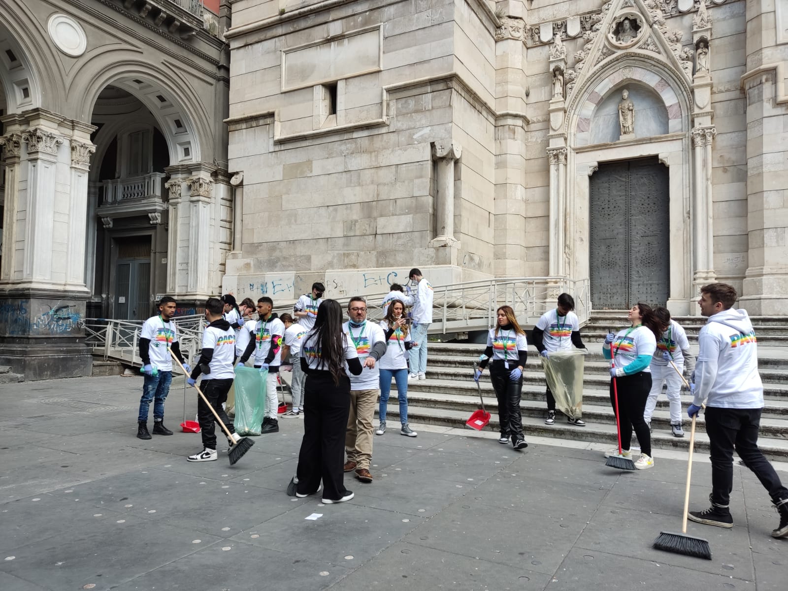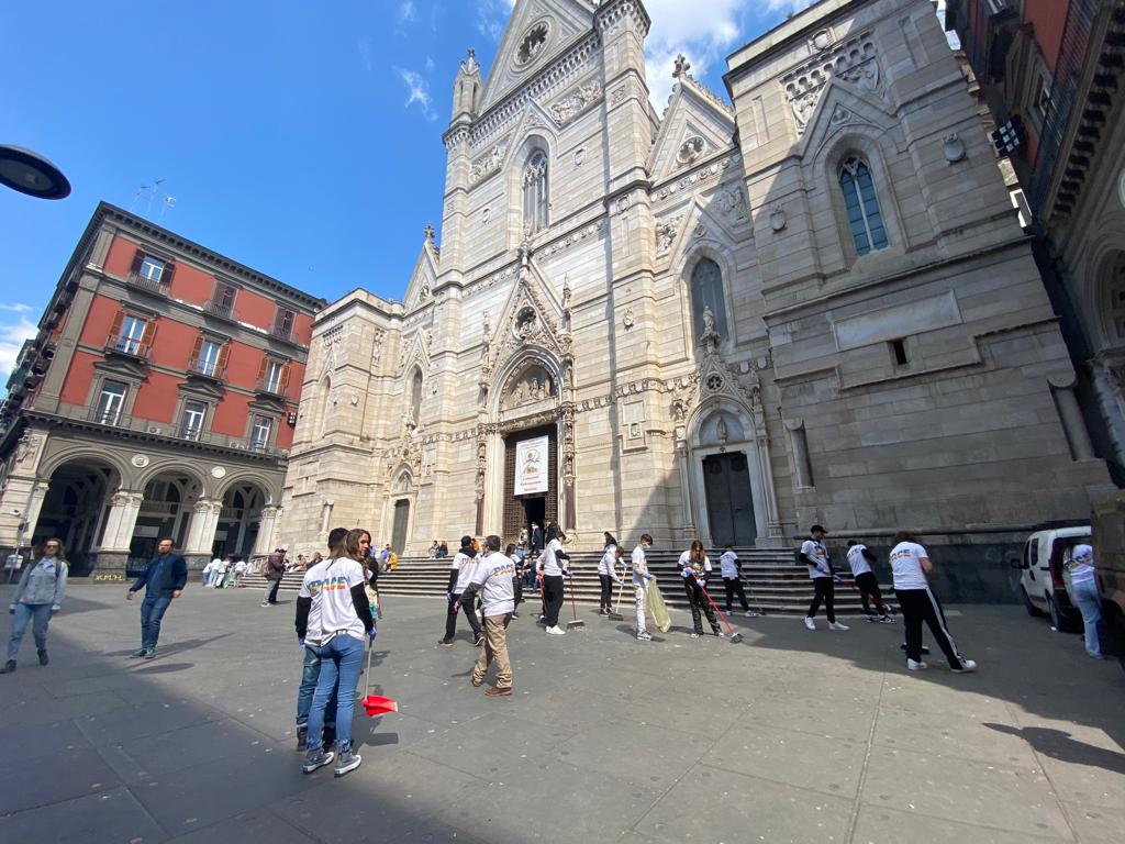 Rigenerazione urbana in Piazzetta Sedil Capuano, in Piazza Sisto Riario Sforza e al Duomo di Napoli, muniti di scope, palette e buste.